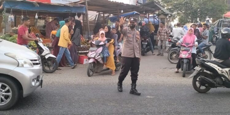 LHOKSEUMAWE – Personel Polsek Samudera membantu masyarakat menyeberang jalan pada saat melaksanakan strong poin jelang waktu berbuka puasa di Keude Geudong, Aceh Utara, wilayah hukum Polres Lhokseumawe, Selasa (18/4/2023) sore.