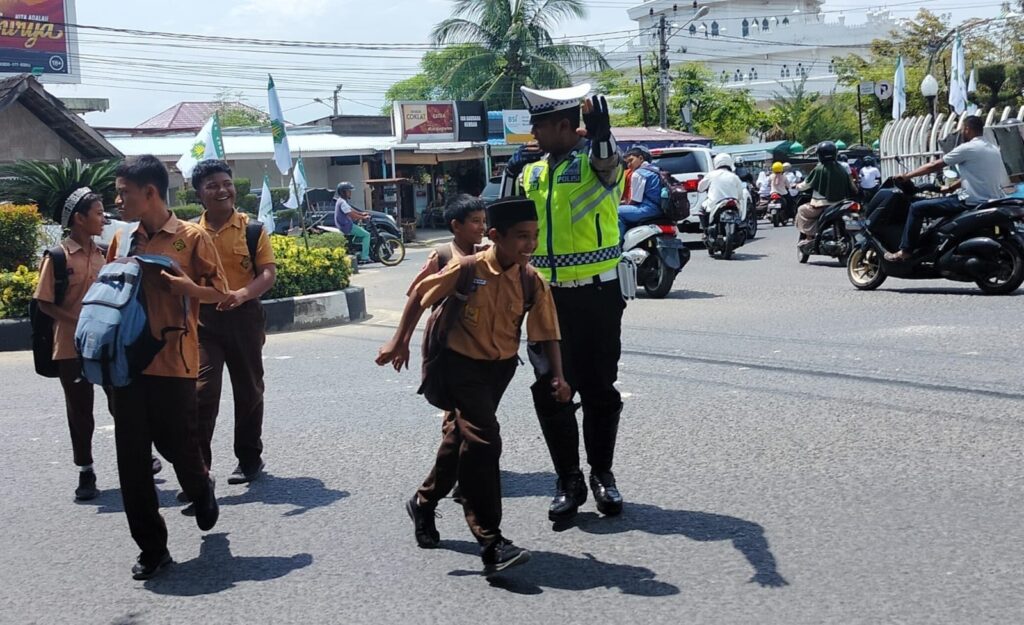 LHOKSEUMAWE – Polantas Lhokseumawe membantu siswa menyeberang jalan pada k pulang sekolah, kegiatan ini dilakukan personel saat melaksanakan strong poin di depan Pos Lantas, Cunda, Muara Dua Kota Lhokseumawe, Rabu (22/2/2023) siang.