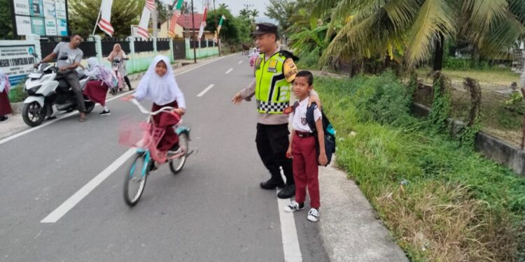 Aceh Utara – Kepedulian terhadap keselamatan pelajar diwujudkan personel Polsek Syamtalira Bayu, saat melaksanakan giat Strong Point pengamanan dan pengaturan arus lalu lintas di Jalan Raya Medan–Banda Aceh, tepatnya di Simpang Cot Plieng, Kecamatan Syamtalira Bayu, Kabupaten Aceh Utara, Senin (11/8/2025) pagi.