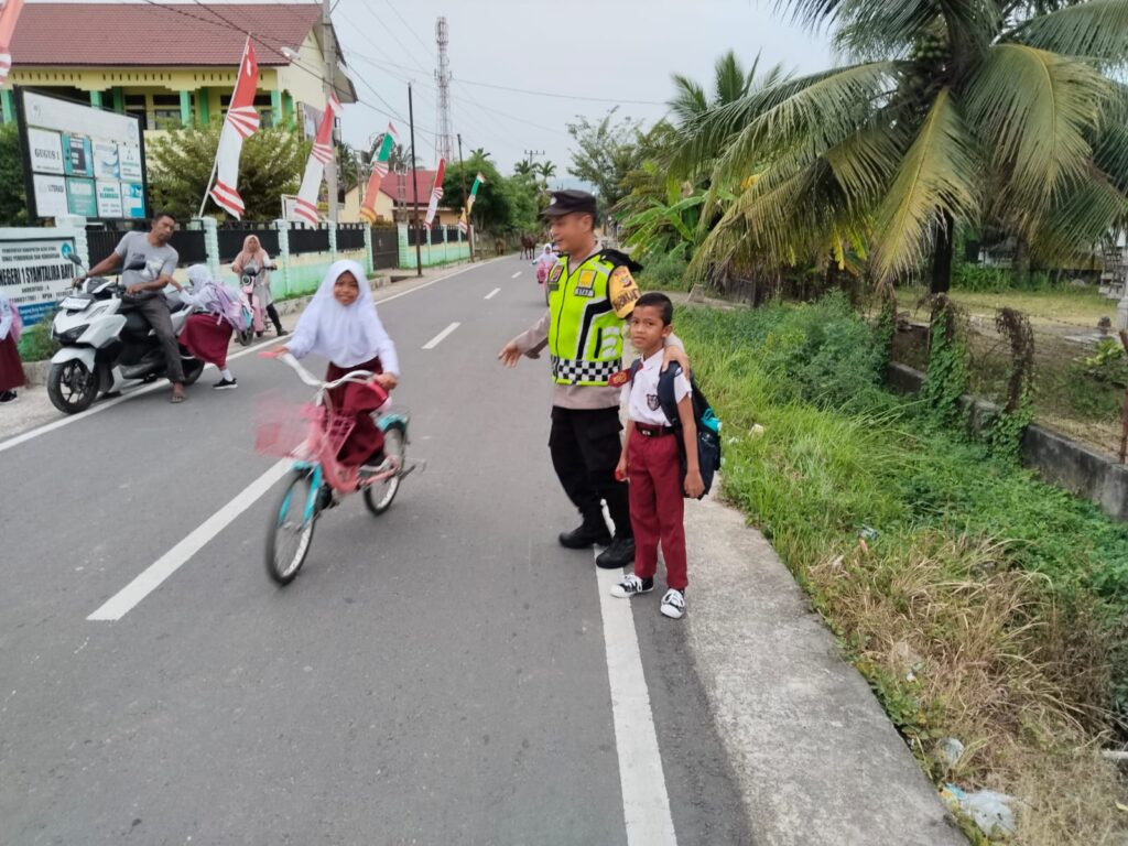 Aceh Utara – Kepedulian terhadap keselamatan pelajar diwujudkan personel Polsek Syamtalira Bayu, saat melaksanakan giat Strong Point pengamanan dan pengaturan arus lalu lintas di Jalan Raya Medan–Banda Aceh, tepatnya di Simpang Cot Plieng, Kecamatan Syamtalira Bayu, Kabupaten Aceh Utara, Senin (11/8/2025) pagi.