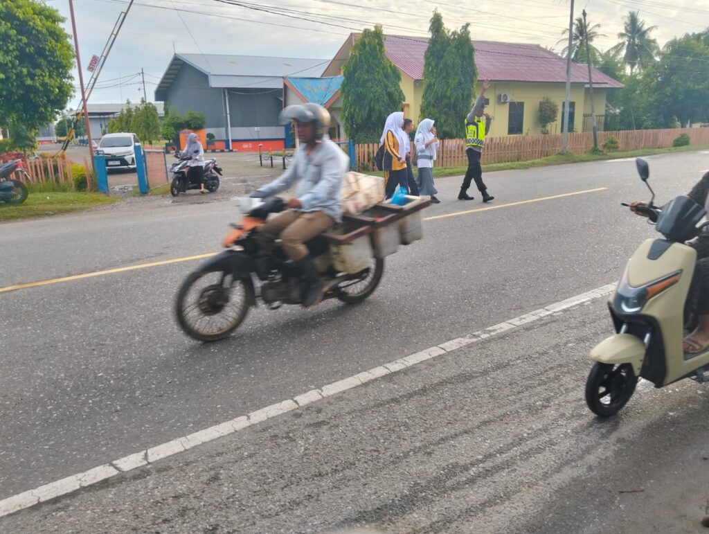 Sebanyak dua personel Polsek Blang Mangat diterjunkan untuk mengatur arus kendaraan serta membantu penyeberangan siswa, guna memastikan keselamatan dan kelancaran lalu lintas di lokasi tersebut.