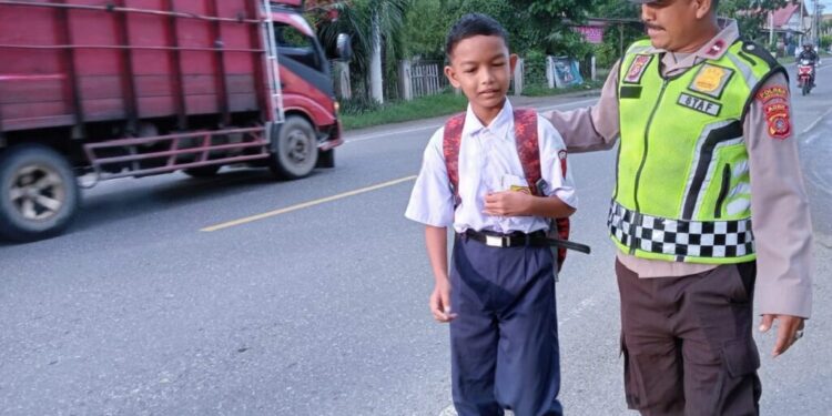 Lhokseumawe – Personel Polsek Blang Mangat melaksanakan giat strong point berupa pengamanan dan pengaturan arus lalu lintas di Jalan Medan–Banda Aceh, tepatnya di Desa Ule Blang Mane, Kecamatan Blang Mangat, Kota Lhokseumawe, Senin (1/9/2025) pagi.