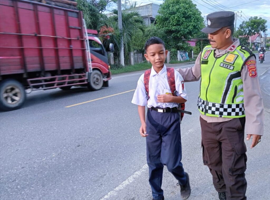 Lhokseumawe – Personel Polsek Blang Mangat melaksanakan giat strong point berupa pengamanan dan pengaturan arus lalu lintas di Jalan Medan–Banda Aceh, tepatnya di Desa Ule Blang Mane, Kecamatan Blang Mangat, Kota Lhokseumawe, Senin (1/9/2025) pagi.