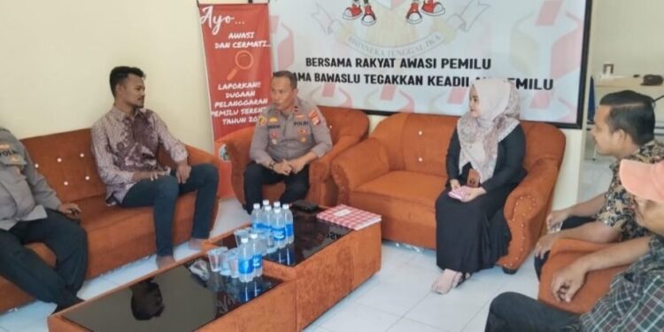 LHOKSEUMAWE _ Kapolsek Banda Sakti, Ipda Arizal, SH silaturrahmi ke kantor Panitia pengawas kecamatan (Panwascam) Banda Sakti di Desa Lancang Garam, Kota Lhokseumawe, Rabu (5/7/2023).