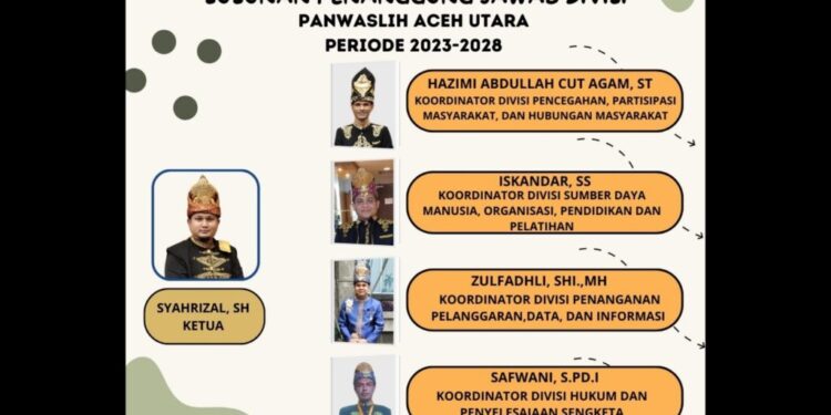 Terakhir yaitu Safwani, S.Pdi sebagai Koordinator Divisi Hukum dan Penyelesaian Sengketa. Itulah susunan penanggung jawab divisi Panwaslih Aceh Utara Periode 2023-2028.