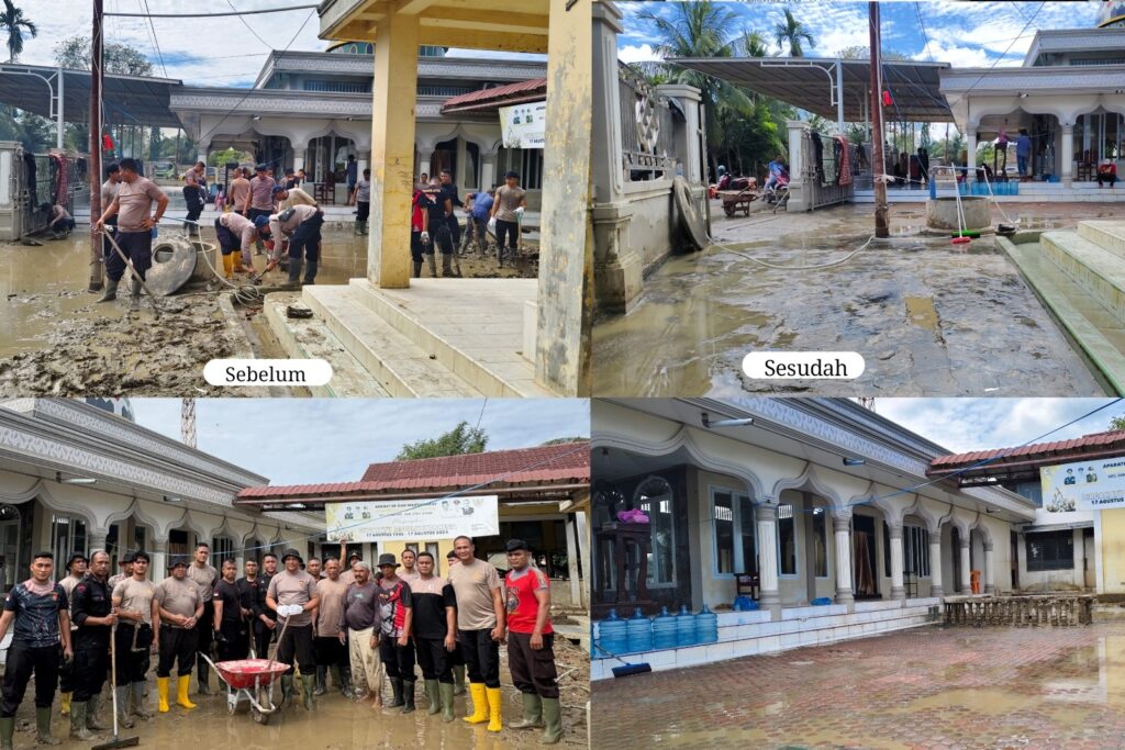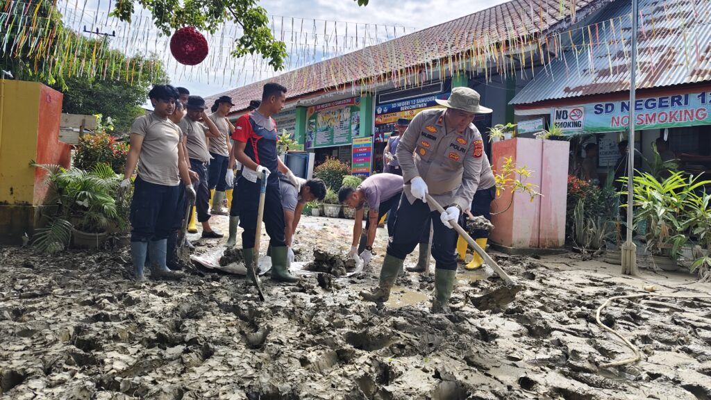 Lhokseumawe — Polres Lhokseumawe bersama personel Batalyon B Pelopor Brimob Polda Aceh melaksanakan kegiatan bakti sosial berupa pembersihan lumpur sisa ...