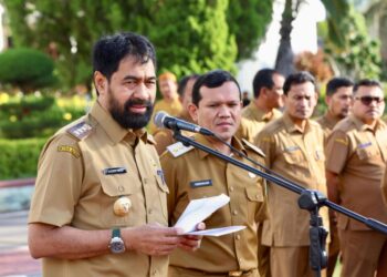 Banda Aceh : Gubernur Aceh, Muzakir Manaf, memimpin apel pagi di halaman Kantor Gubernur Aceh, Selasa (8/4/2025), yang diadakan setelah ...