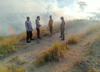 LHOKSEUMAWE - Personel Polsek Muara Satu mengamankan TKP kebakaran lahan di Dusun III Ulee Buket, Desa Blang Panyang, Kecamatan ...