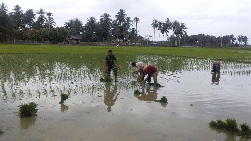 LHOKSEUMAWE - Mendukung ketahanan pangan, Babinsa Koramil 12/Tnp, Kodim 0103/Aut, Serda Bukhari M, membantu petani membersihkan rumput liar di sawah ...