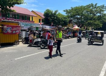 LHOKSEUMAWE - Tim Unit Reaksi Cepat (URC) Sat Samapta Polres Lhokseumawe mengatur arus lalu lintas di Masjid Jamik, Kota Lhokseumawe, ...