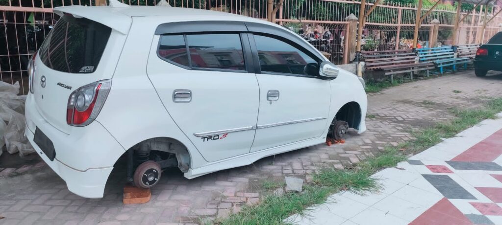 LHOKSEUMAWE - Empat buah ban mobil yang sedang parkir di depan SMA Negeri 1 Lhokseumawe Jalan Darussalam, Kampung Jawa Lama, ...
