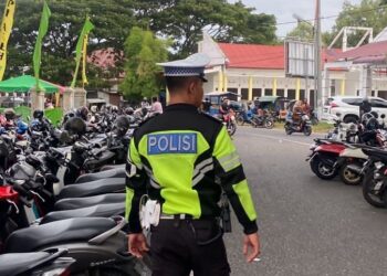 LHOKSEUMAWE - Tim Unit Reaksi Cepat (URC) Sat Samapta Polres Lhokseumawe mengatur arus lalu lintas di Masjid Jamik, Kota Lhokseumawe, ...