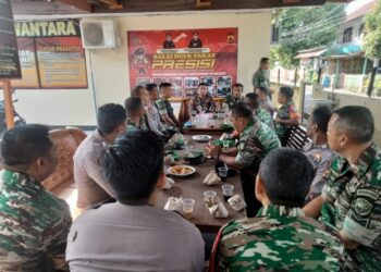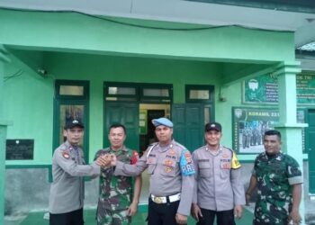Lhokseumawe - Tingkatkan sinergitas dan soliditas TNI-Polri, Personil Polsek Nisam kunjungi Koramil 23 Nisam di Desa Meucat Kec. Nisam Kab. ...