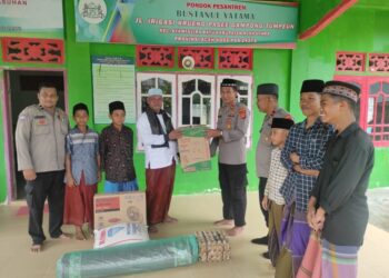 LHOKSEUMAWE - Kapolsek Syamtalira Bayu, Iptu Sirya Iqbal, SH, MH menyerahkan bantuan kepada Pesantren Bustanul Yatama Desa Teumpen, Kecamatan ...