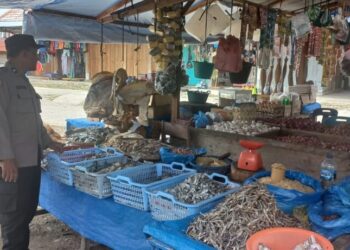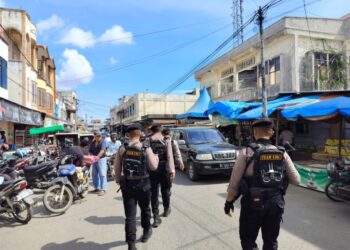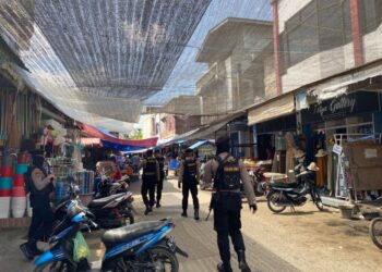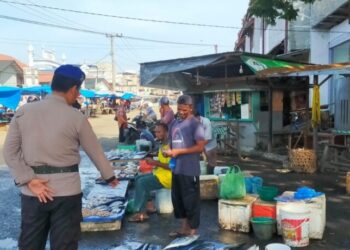 LHOKSEUMAWE - Personel Polsek Kuta Makmur turun ke pasar Keude Blang Ara, Kecamatan Kuta Makmur, Aceh Utara, wilayah hukum Polres ...