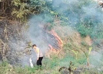LHOKSEUMAWE - Personel Polsek Muara Dua bersama petugas pemadam kebakaran memadamkan api yang membakar lahan kosong di Dusun C Cot ...