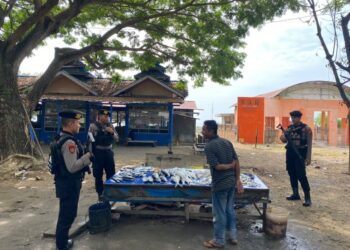 LHOKSEUMAWE - Patroli antisipasi premanisme, Tim Unit Reaksi Cepat (URC) Sat Samapta Polres Lhokseumawe menyambagi pedagang ikan di kawasan Pusong, ...