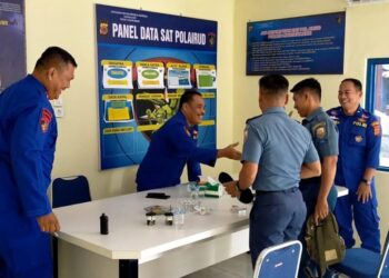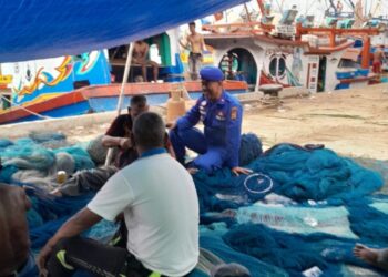 LHOKSEUMAWE - Personel Satpolairud Polres Lhokseumawe melaksanakan patroli rutin dan menyambagi nelayan di PPI Pusong, Kecamatan Banda Sakti, Kota ...