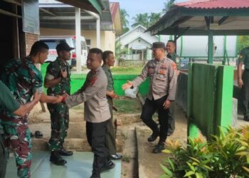 LHOKSEUMAWE - Bangun sinergitas dan soliditas dengan TNI, Kapolsek Meurah Mulia, Ipda M Ramadhan S, SH mengunjungi Makoramil 07/MRM, ...