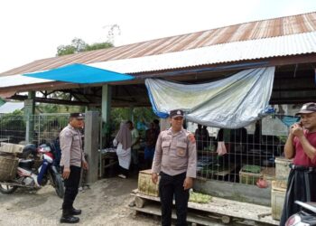 LHOKSEUMAWE - Personel Polsek Nisam melakukan monitoring stok sembako di pasar tradisional di Kecamatan Nisam, Aceh Utara, wilayah hukum Polres ...