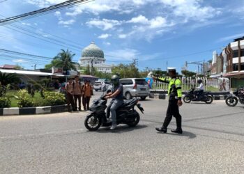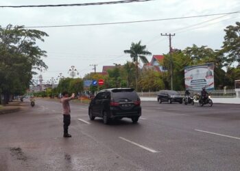LHOKSEUMAWE - Personel Polsek Banda Sakti mengatur arus lalu lintas di Simpang BTN, Kota Lhokseumawe, Rabu (1/3/2023), kegiatan tersebut ...