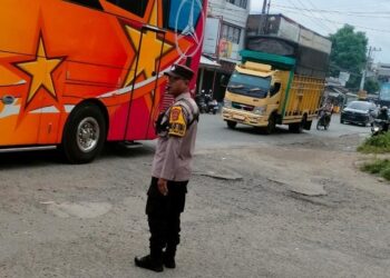 LHOKSEUMAWE - Personel Polsek Dewantara melaksanakan pengaturan lalu lintas di Simpang IV Keude Krueng Geukueh, Dewantara, Aceh Utara, wilayah ...