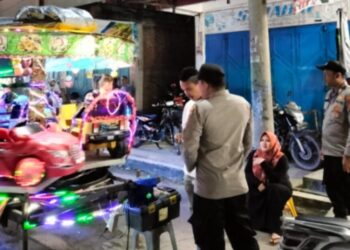 LHOKSEUMAWE - Personel Polsek Syamtalira Bayu memantau situasi di tempat bermain anak - anak saat melaksanakan patroli antispasi gangguan ...