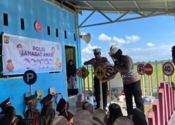 LHOKSEUMAWE - Polisi sahabat anak, Polantas Lhokseumawe beri edukasi tentang tertib berlalu lintas kepada murid PAUD Al-Faizu, Desa Pulo ...