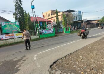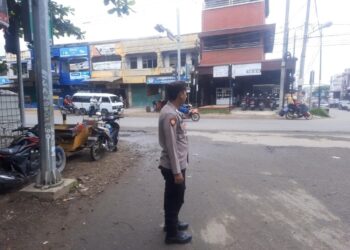 LHOKSEUMAWE - Personel Polsek Syamtalira Bayu mengatur arus lalu lintas di Simpang Keude Bayu, Aceh Utara, wilayah hukum Polres ...