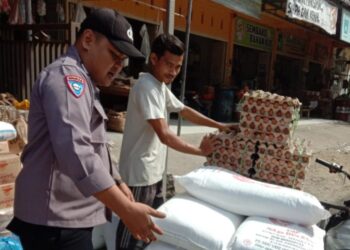 LHOKSEUMAWE - Personel Polsek Samudera mengecek stok beras dengan menyambagi pedagang kelontong di Kecamatan Samudera, Aceh Utara, wilayah hukum ...
