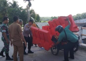 LHOKSEUMAWE - Cegah kecelakaan lalu lintas, Kapolsek Blang Mangat, Iptu Saprudin, SH, MH bersama unsur Muspika melakukan pemasangan pembatas ...
