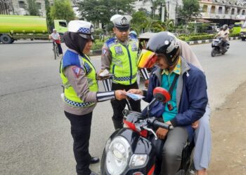 LHOKSEUMAWE - Polantas Lhokseumawe mensosialisasikan tertib berlalu lintas dan membagikan brosur kepada pengguna jalan raya di depan bundaran Pos ...