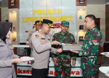 LHOKSEUMAWE - Personel Polsek Syamtalira Bayu menerima kue dan ucapan selamat Hari Bhayangkara ke 77 dari jajaran Koramil Syamtalira ...