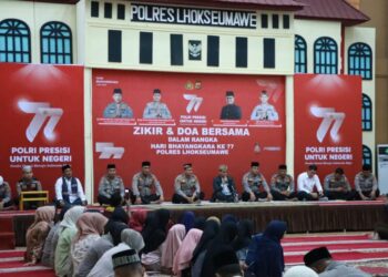 Lhokseumawe - Polres Lhokseumawe gelar zikir dan doa bersama dalam hari Bhayangkara ke 77 yang berlangsung di gedung serbaguna Wirasatya ...