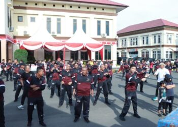 LHOKSEUMAWE - Jajaran Polres Lhokseumawe menggelar senam bersama dalam rangka memeriahkan Hari Bhayangkara ke 77, kegiatan tersebut berlangsung di lapangan ...