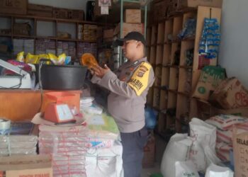 LHOKSEUMAWE - Personel Polsek Nisam, Polres Lhokseumawe monitoring stok sembako di pasar Gampong Barat, Kecamatan Nisam, Aceh Utara, wilayah ...