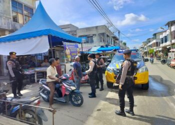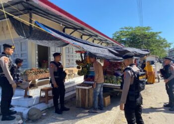 LHOKSEUMAWE - Patroli cegah aksi premanisme, Tim Unit Reaksi Cepat (URC) Sat Samapta Polres Lhokseumawe menyambagi pedagang di pasar ...