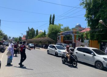 LHOKSEUMAWE - Tim Unit Reaksi Cepat (URC) Sat Samapta Polres Lhokseumawe mengatur arus lalu lintas dan membantu siswa menyeberang ...