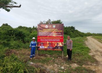 LHOKSEUMAWE – Personel Polsek Muara Satu memasang spanduk tentang pencegahan kebakaran hutan dan lahan (karhutla) di Gampong (Desa) Blang Naleung ...