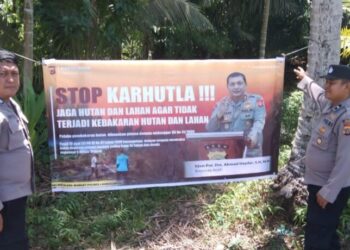 LHOKSEUMAWE – Personel Polsek Blang Mangat memasang spanduk himbauan pencegahan kebakaran hutan dan lahan (Karhutla) di sejumlah titik di wilayah ...