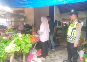 LHOKSEUMAWE - Personel Polsek Syamtalira Bayu menyampaikan himbauan kepada pedagang saat melaksanakan patroli dan pengecekan stok sembako di pasar Keude ...