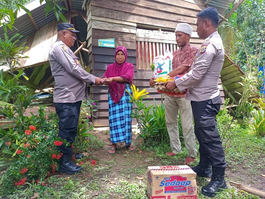 LHOKSEUMAWE - Kapolsek Meurah Mulia, Iptu Ade Candra menyerahkan bantuan kepada korban rumah rusak akibat angin kencang di Gampong Paya ...