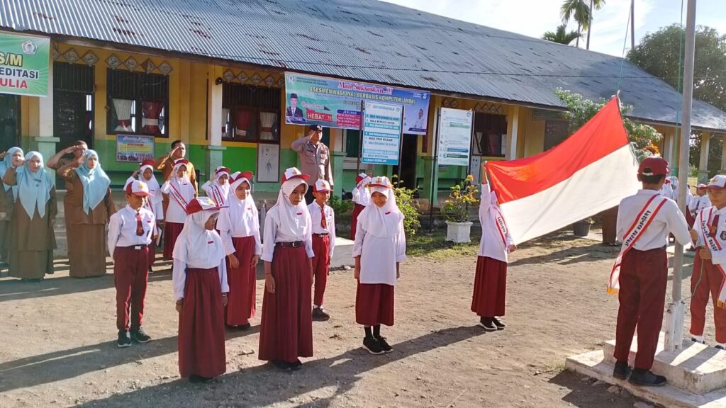 LHOKSEUMAWE -Kanit Binmas Polsek Meurah Mulia, Aipda Dedi P Saragih menjadi pembina upacara di SDN Negeri 9 Meurah Mulia, Aceh ...