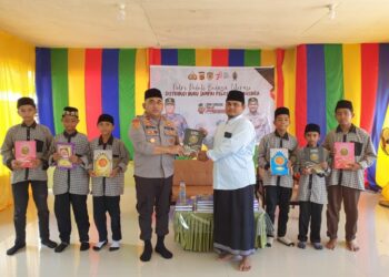 LHOKSEUMAWE - Kapolsek Muara Dua, Ipda Roni menyerahkan Al Qur'an ke Dayah Sirajul Muna Desa Blang Cruem, Kecamatan Muara Dua, ...