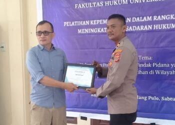 LHOKSEUMAWE - Kapolsek Muara Satu, Iptu Syahrizal memberikan penyuluhan hukum kepada mahasiswa Unimal, kegiatan tersebut berlangsung di aula kantor ...