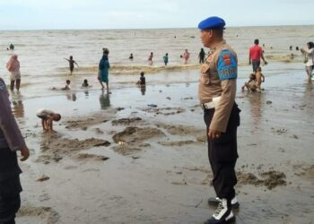 LHOKSEUMAWE - Personel Polsek Syamtalira Bayu melakukan patroli di pantai Lancok, Aceh Utara, wilayah hukum Polres Lhokseumawe, Minggu (2/7/2023), kegiatan ...