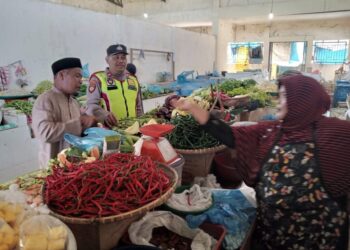 LHOKSEUMAWE - Monitoring stok sembako, personel Polsek Syamtalira Bayu patroli dan sambang pedagang di pasar Keude Bayu, Aceh Utara, ...