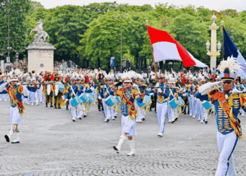 Paris - Sorak sorai masyarakat yang memenuhi Place de la Concorde pada Senin (14/07/2025), bergemuruh saat derap langkah tegap dan ...