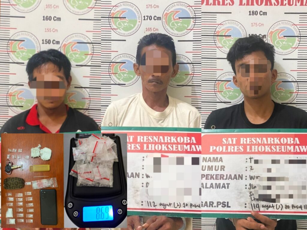 LHOKSEUMAWE - Tim Opsnal Sat Resnarkoba Polres Lhokseumawe membekuk tiga tersangka narkotika jenis sabu-sabu di Kecamatan Banda Sakti, Kota Lhokseumawe, ...