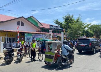 LHOKSEUMAWE - Personel Sat Samapta Polres Lhokseumawe melaksanakan patroli bersepeda dan mengatur arus lalu lintas pada saat jam pulang sekolah ...